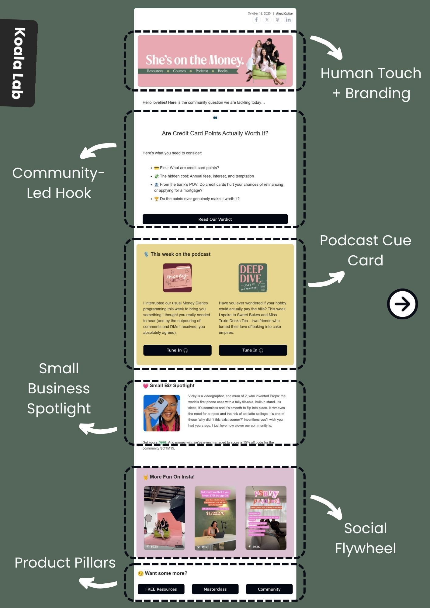 The email opens with a warm, welcoming tone - featuring a friendly team headshot and clear navigation to key product pillars (podcast, resources, and courses). This instantly establishes brand familiarity and trust while reinforcing Sheโs on the Moneyโs multi-channel ecosystem.